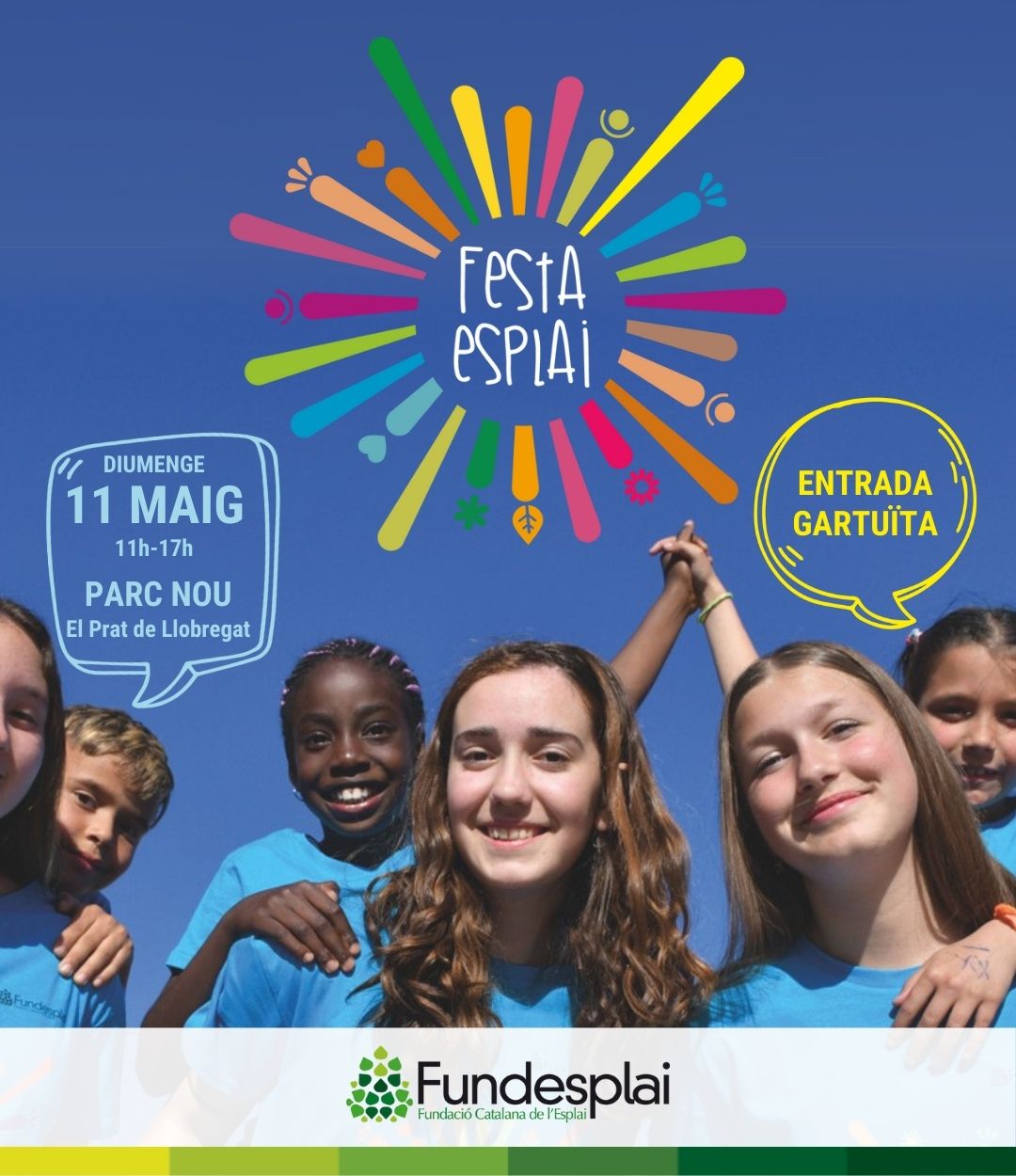 Festa Esplai és la gran festa del lleure educatiu de Fundesplai i la Federació Catalana de l’Esplai oberta a infants, joves, famílies i monitores i monitors d’arreu de Catalunya. El 2025 la celebrarem el diumenge 11 de maig, al Parc Nou del Prat de Llobregat!