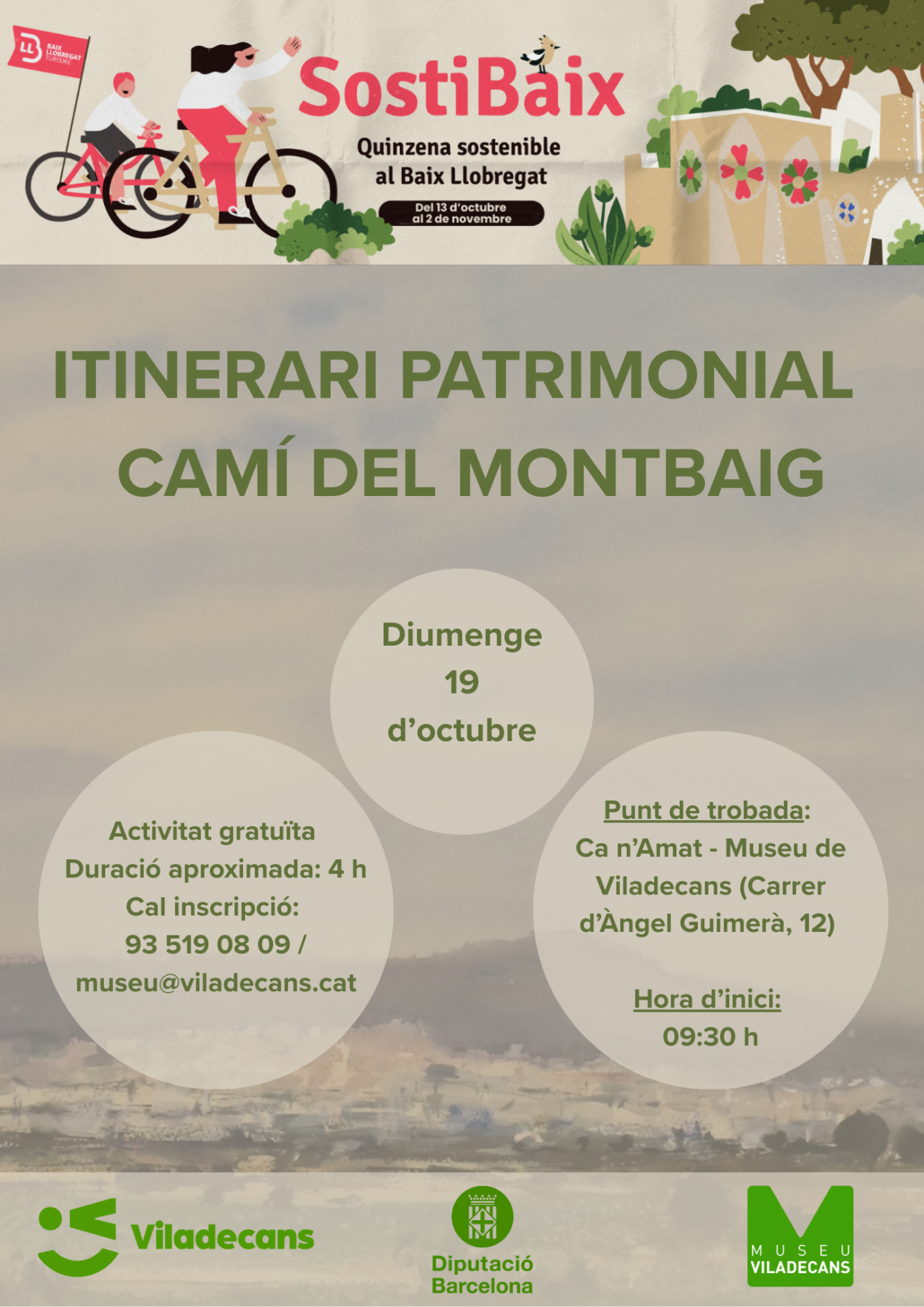 Per aquest motiu us convidem a l'itinerari del Camí de Montbaig es tracta d'una passejada pel samontà de la serra del Montbaig; pujada al puig de Montbaig i ermita de Sant Ramon. Parlarem dels antics masos de muntanya, dels conreus, de l'aprofitament dels boscos, del poblat ibèric no excavat del puig de Montbaig, de l'ermita de Sant Ramon i moltes altres qüestions de la història i el patrimoni de la ciutat. El punt i hora de trobada és a Ca n'Amat - Museu de Viladecans (Carrer d'Àngel Guimerà, 12) a les 9:30 h. Cal portar roba i sabates còmodes. Aigua i esmorzar. Caminarem al voltant de 9 quilòmetres.