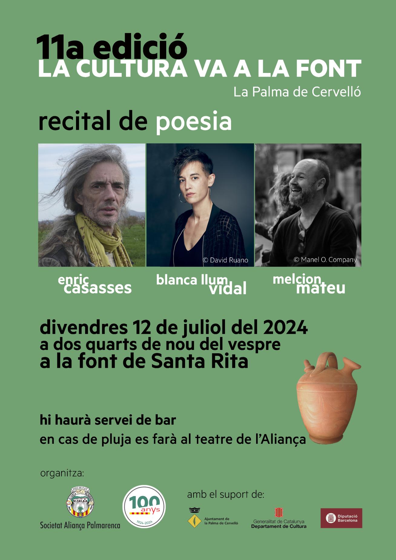 Recital de poesia de l'11a edició del festival la Cultura Va a la Font, amb els poetes Enric Casasses, blanca Llum Vidal i Melcion Mateu a la font de Santa Rita de la Palma de Cervelló.