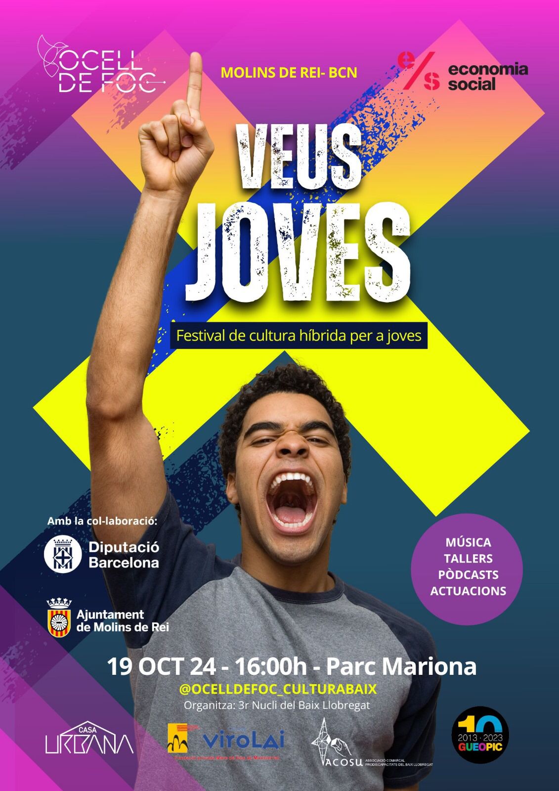 Nou festival que pretén donar veu i visibilitat als i les joves envers la salut mental a través de la cultura. Aquest projecte neix del projecte @ocelldefoc_culturabaix amb la participació de diverses entitats i sectors de joves del nucli. Activitats, tallers, pòdcasts en directe i un gran espectacle final de Làser Show posaran nom al Festival Joves! Fes-te escoltar!