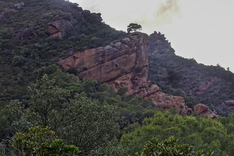 Cingles sota la Roca del Migdia. Les roques característiques de tota aquesta zona són sorrenques i compactades: gresos i conglomerats de color vermell.