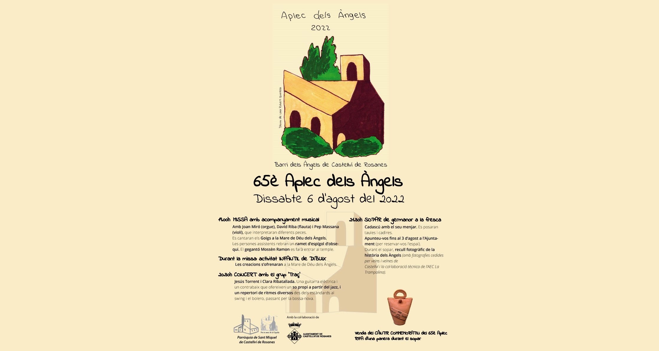 Missa en honor de la Mare de Déu dels Àngels, concert, sopar a la fresca, venda del càntir commemoratiu de l'aplec i rifa.
