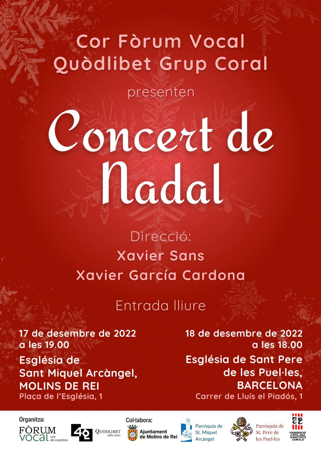 Cor Fòroum Vocal i Quòdlibat Grup Coral Presenten el Concert de Nadal, amb direcció de Xavier Sans i Xavier García Cardona.