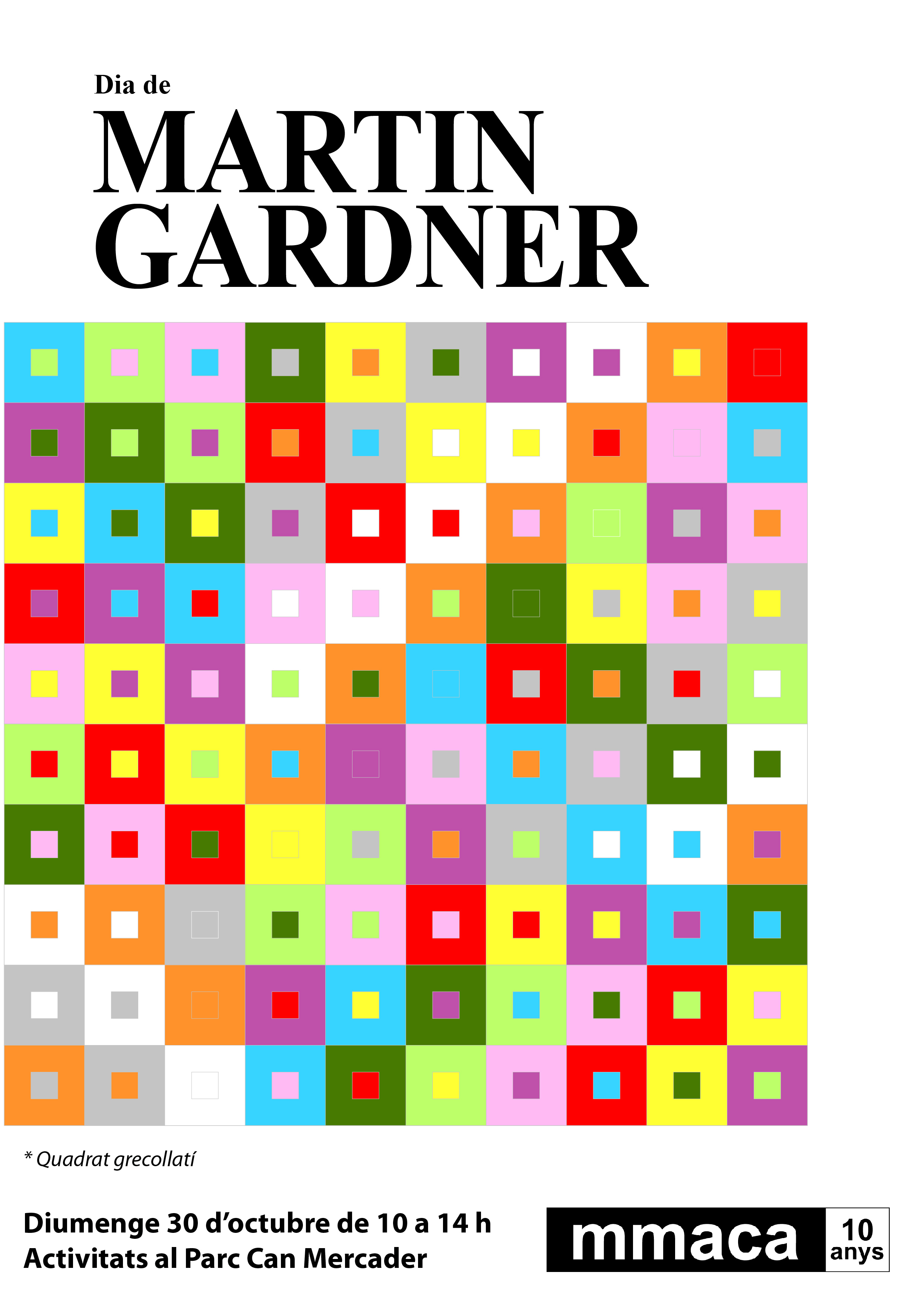 Com és tradicional, al Museu de Matemàtiques de Catalunya celebrem la data del naixement de Martin Gardner amb reptes matemàtics a l'aire lliure per a tota la família. Serà el proper diumenge 30 d'octubre de 10 a 14 al Parc Can Mercader de Cornellà de Llobregat. Hi esteu convidats!