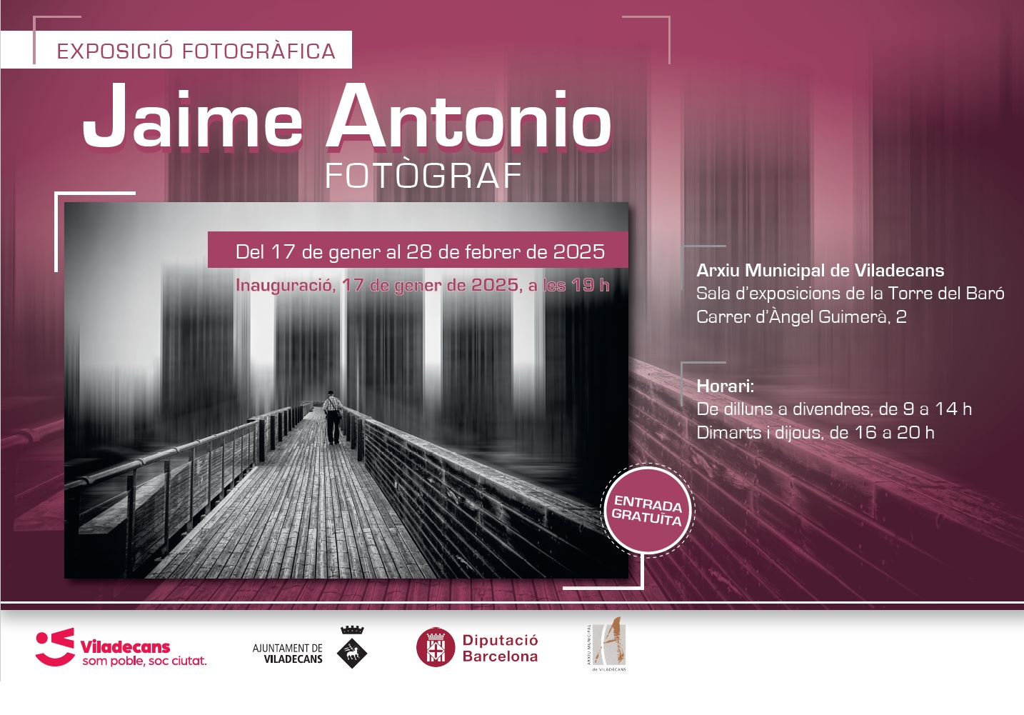 Exposició fotogràfica de Jaime Antonio. Inauguració de l'exposició el 17 de gener a les 19h. a la Torre del Baró de Viladecans (c/ d'Àngel Guimerà, 2). Dates de l'exposició: del 17 de gener al 28 de febrer de 2025. Entrada gratuïta.