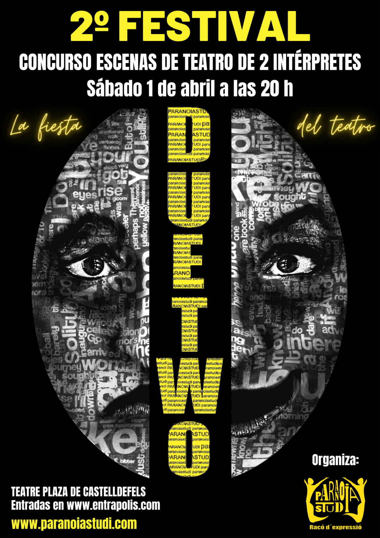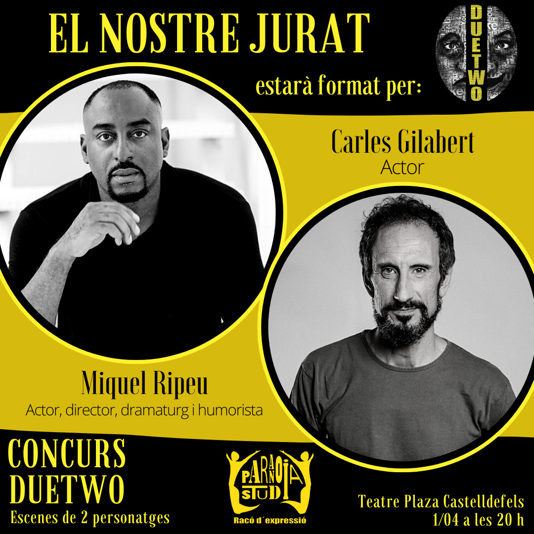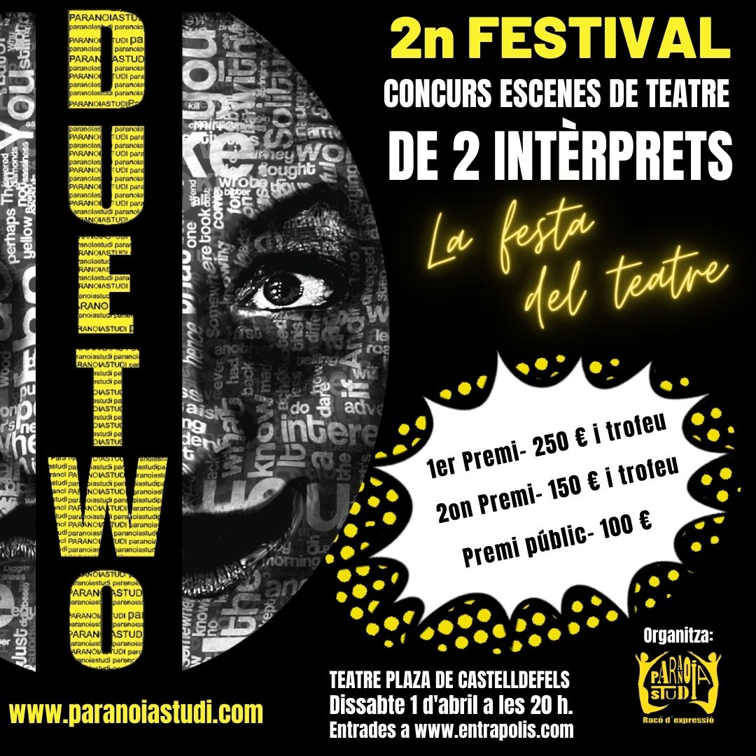 Concurs teatre- Escenes de 2 personatges - 8 parelles, prèviament seleccionades, competiran amb la seva escena de teatre per aconseguir un dels premis. Però a més tindrem actuacions d'artistes convidats. Veureu teatre de qualitat i a més, et necessitem per votar, ja que tu seràs l'encarregat d'atorgar el PREMI DEL PÚBLIC.