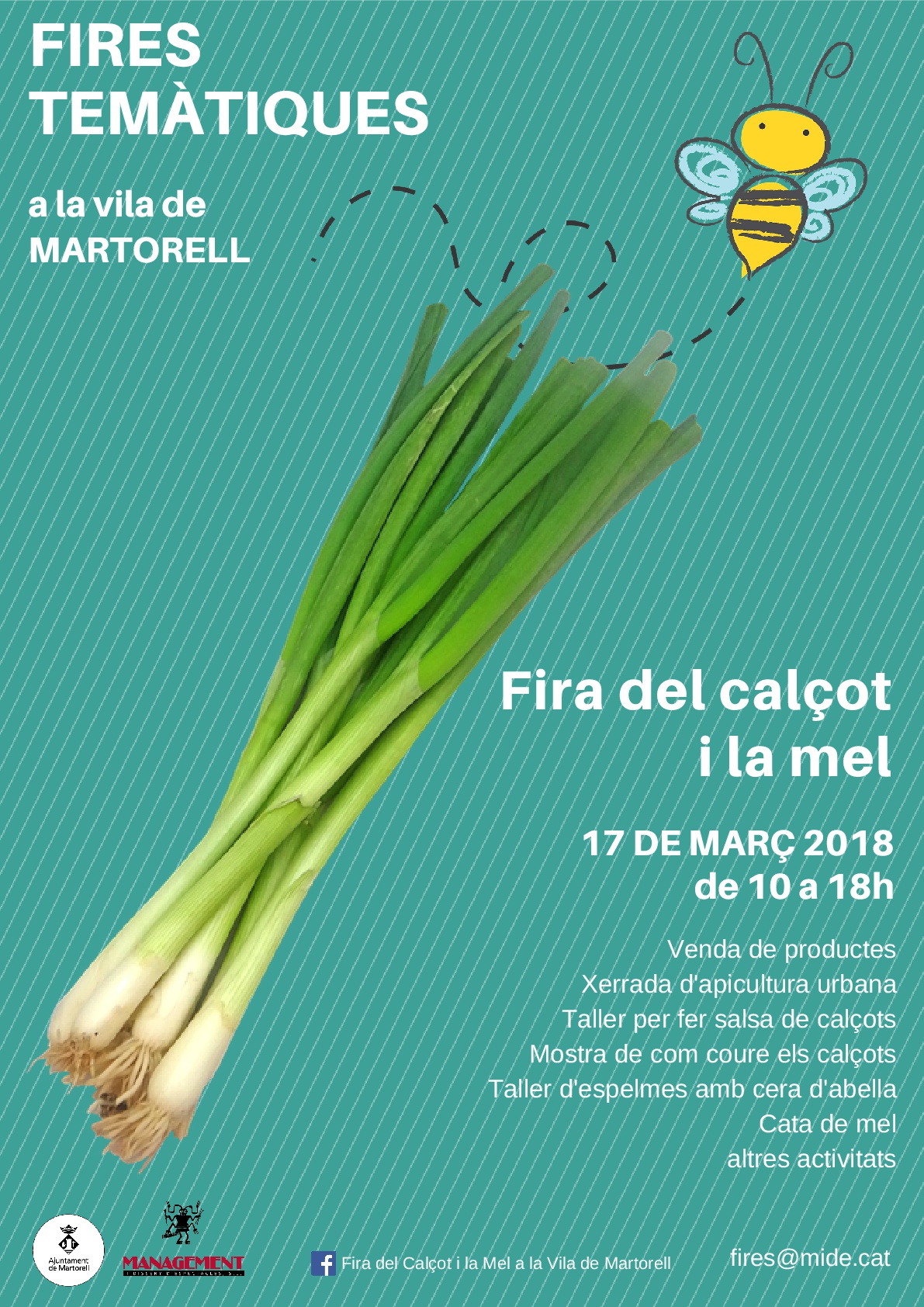 De 10h a 18h podreu gaudir de les diverses activitats que us tenim preparades: tast de calçots, taller de salsa de calçot, xerrada d'apicultura urbana, taller d'espelmes amb cera d'abella, tast de mel, paradetes, venda de productes... Us hi esperem!