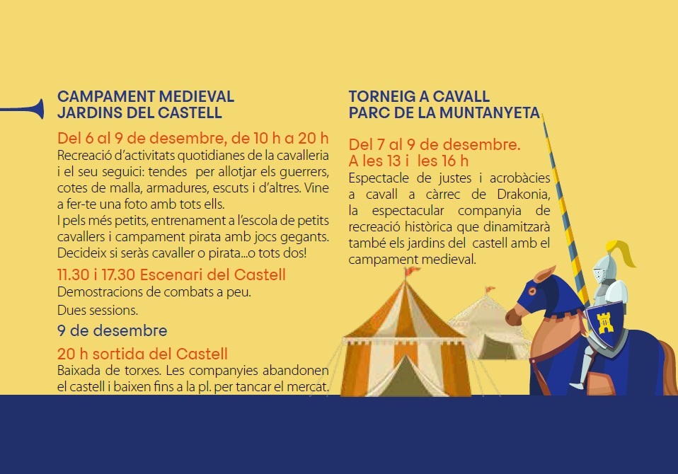 Torna la Fira Medieval a Castelldefels aquest desembre amb el Mercat Medieval, actiu durant cada dia de la fira, jocs medievals, espectacles de recreació històrica, torneigs de cavallers, espectacles, mostra de comerç local, activitats dirigides als més petits i molta música medieval.