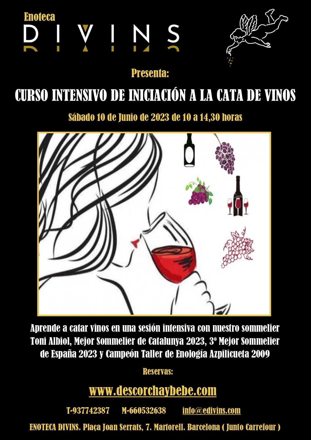 T'agrada el vi i vols conèixer millor els seus secrets, el seu llenguatge, tècniques de servei, conservació, territoris, etc. Toni Albiol, millor Sommelier de Catalunya i 3er. Millor Sommelier d'Espanya 2023 et possarà al dia en un matí de dissabte. Aprent tot sobre els vins blancs, negres, rosats i escumosos. Amb la nostra técnica de tast et garantim que sortiràs sapiguent tastar i am uns bons criteris sobre el vi.