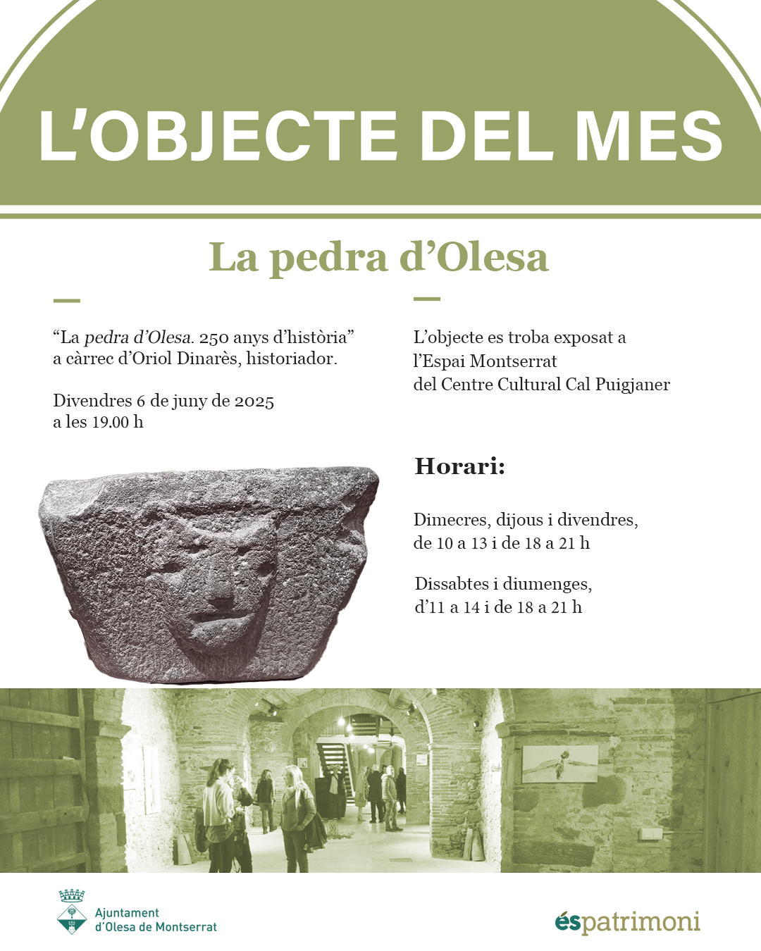 Dins el cicle "L'Objecte del mes", el proper divendres 6 de juny, i dins les festes de Santa oliva, es farà la xerrada "La pedra d'Olesa: 250 anys d'història" a càrrec de l'historiador olesà, Oriol Dinarès.