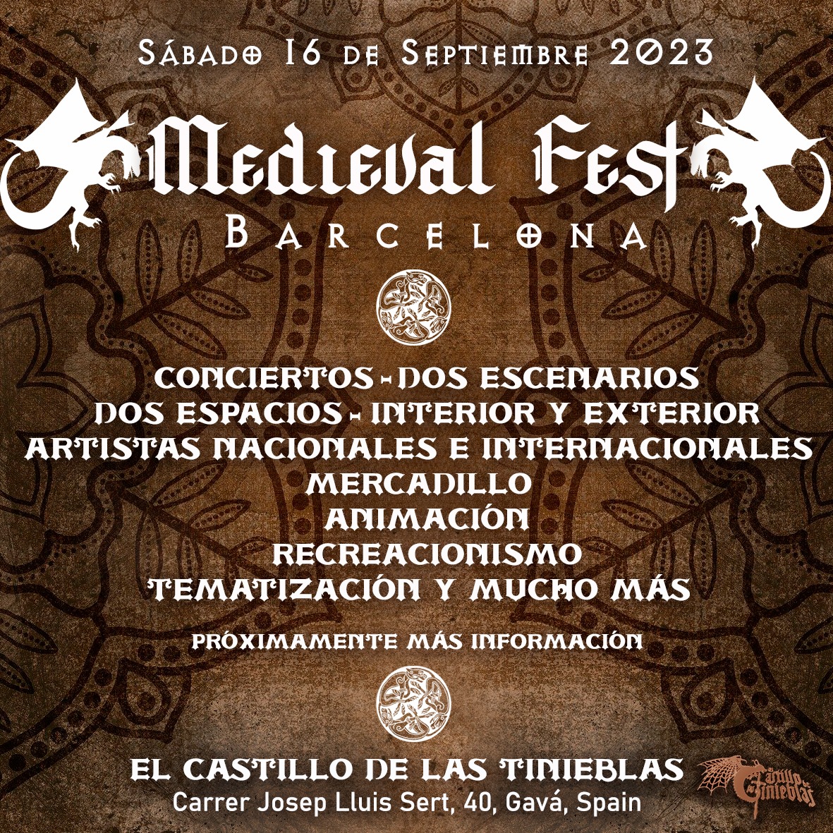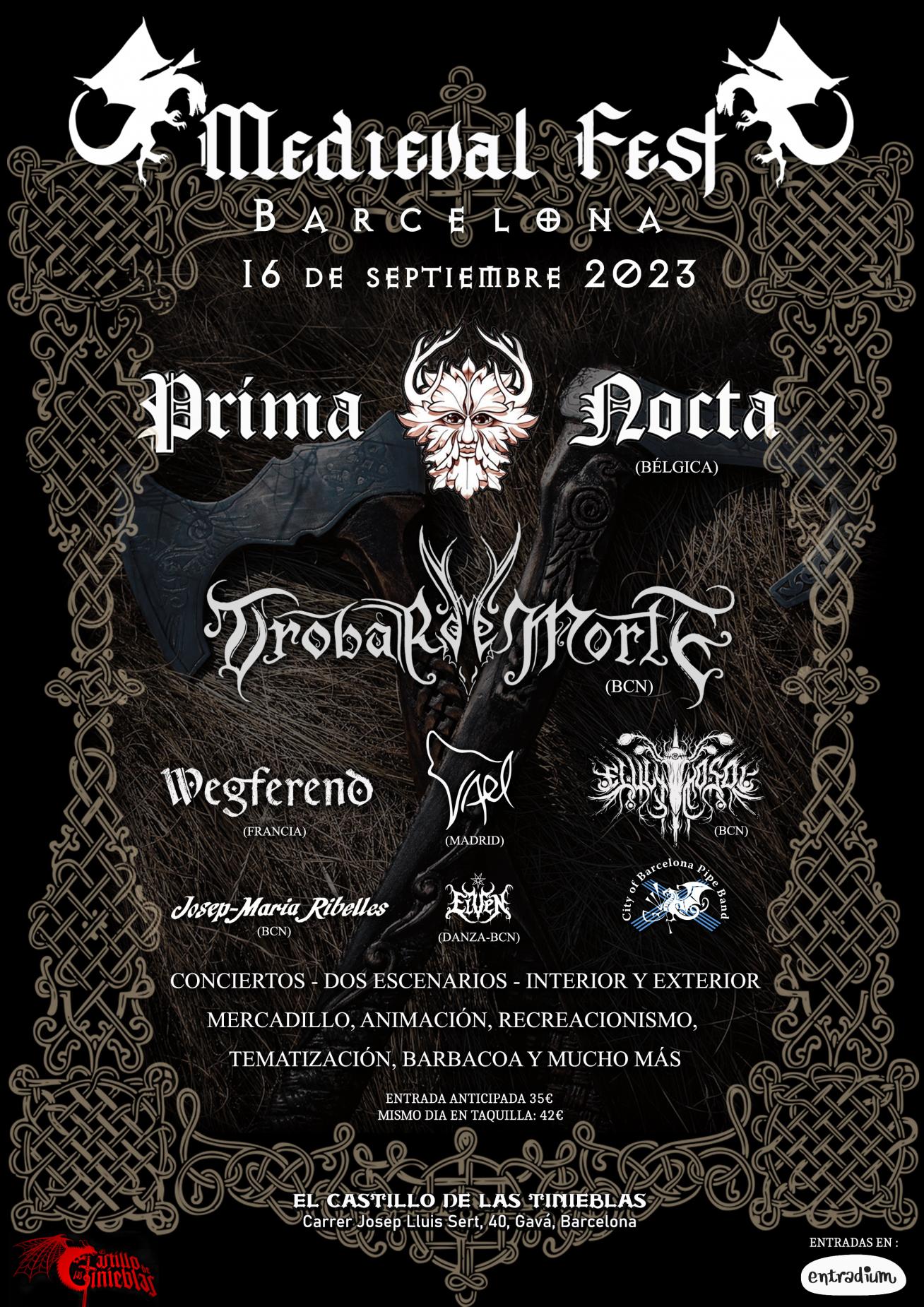 El Medieval Fest Barcelona, que tindrà lloc el dissabte 16 de setembre de 2023, es tracta d'un concepte de festival únic i inèdit a tota Catalunya. Per primera vegada s'aposta per congregar a bandes nacionals i internacionals dels estils medieval, folk contemporani i pagà per a dur a terme actuacions a dos escenaris alternats, un alternat dins de El Castillo de las Tinieblas i un altre a l'exterior, a l'aire lliure.