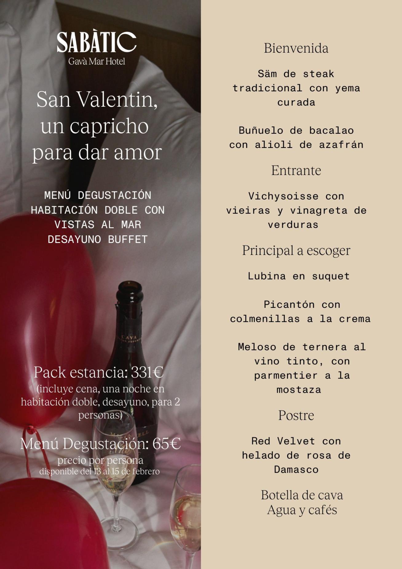 Aquest Sant Valentí deixa't mimar i comença l'any amb molt d'amor a Sabàtic Gavà Mar. Gaudeix del nostre pack de sopar i estada amb esmorzar per 2 persones per 331 € o vine a provar el menú que hem elaborat en exclusiva pel cap de setmana més especial del mes, per 65€ .
