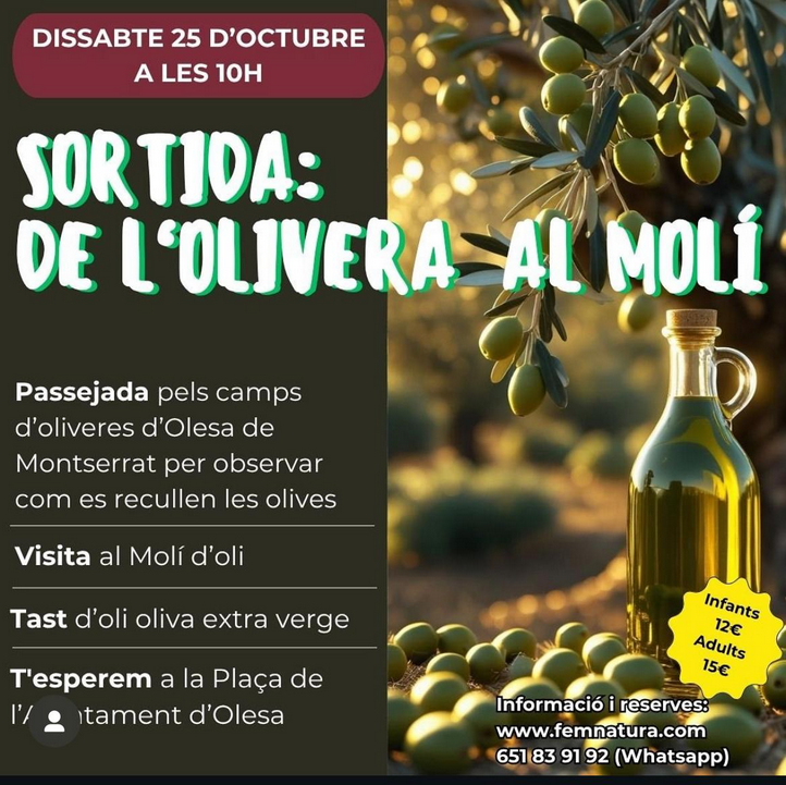 Passejada pels camps d'oliveres d'Olesa de Montserrat per observar com es recullen les olives amb visita al Molí d'oli i tast d'oli d'oliva extra verge.