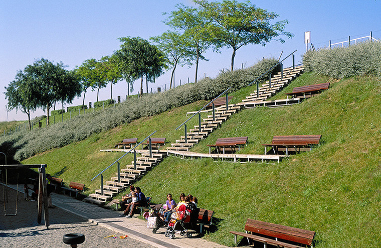 The upper part of the wall, which follows the highway, has become a stroll, with good views over the river valley. The unevenness has been saved with cross-country paths that define the shape of the park and create spaces for stays at different heights. Upholstered areas of vegetation and arranged like stadium stands provide the set with an elegant chromatic game. In the central part there is a large stairway with three intermediate landings. The rest of the flat areas are smaller and are designed for the walk and rest. The resulting set is a range of spaces with very different uses, orientation and views.