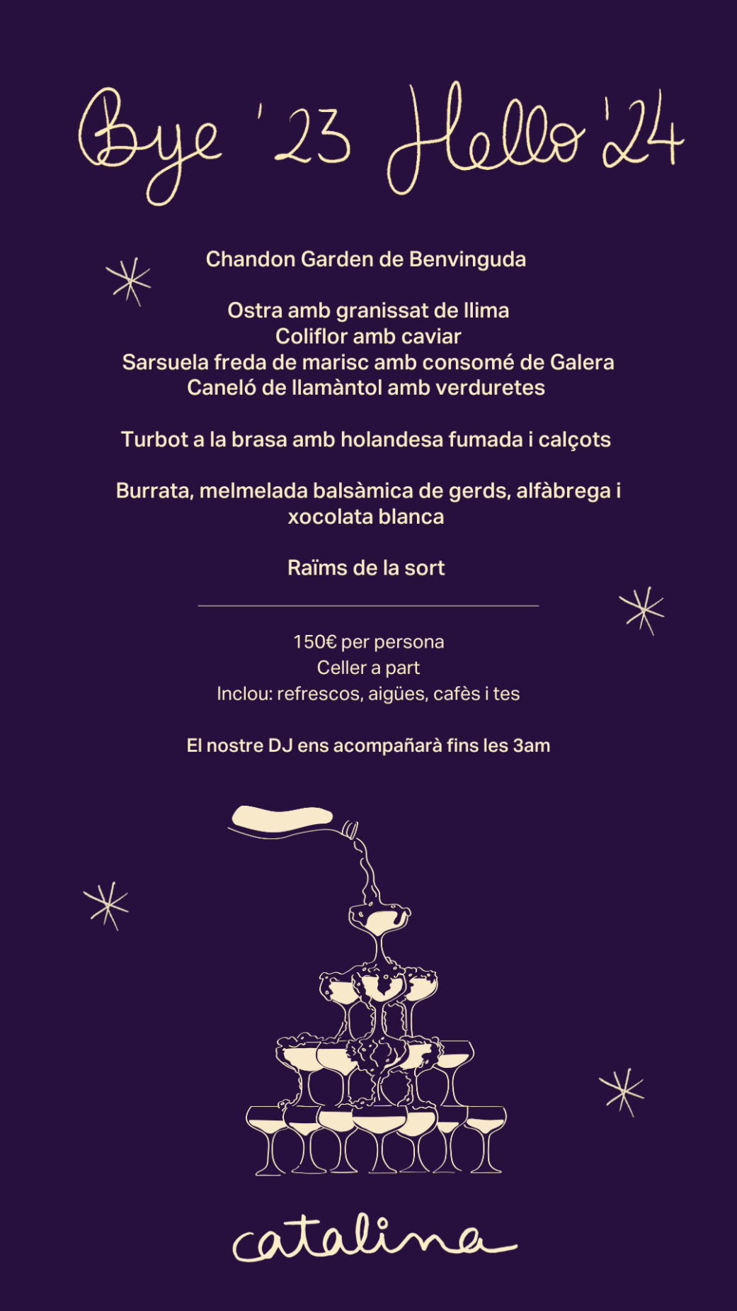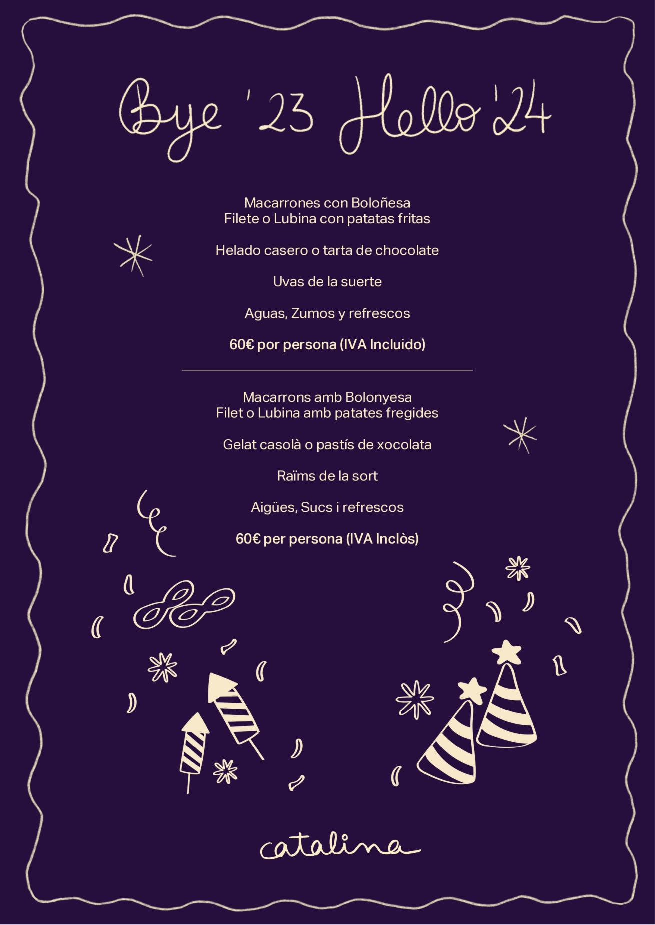 Per Cap d'Any oferim un menú especial amb festa al Catalina per poder acomiadar-nos del 2023 tots junts en família!