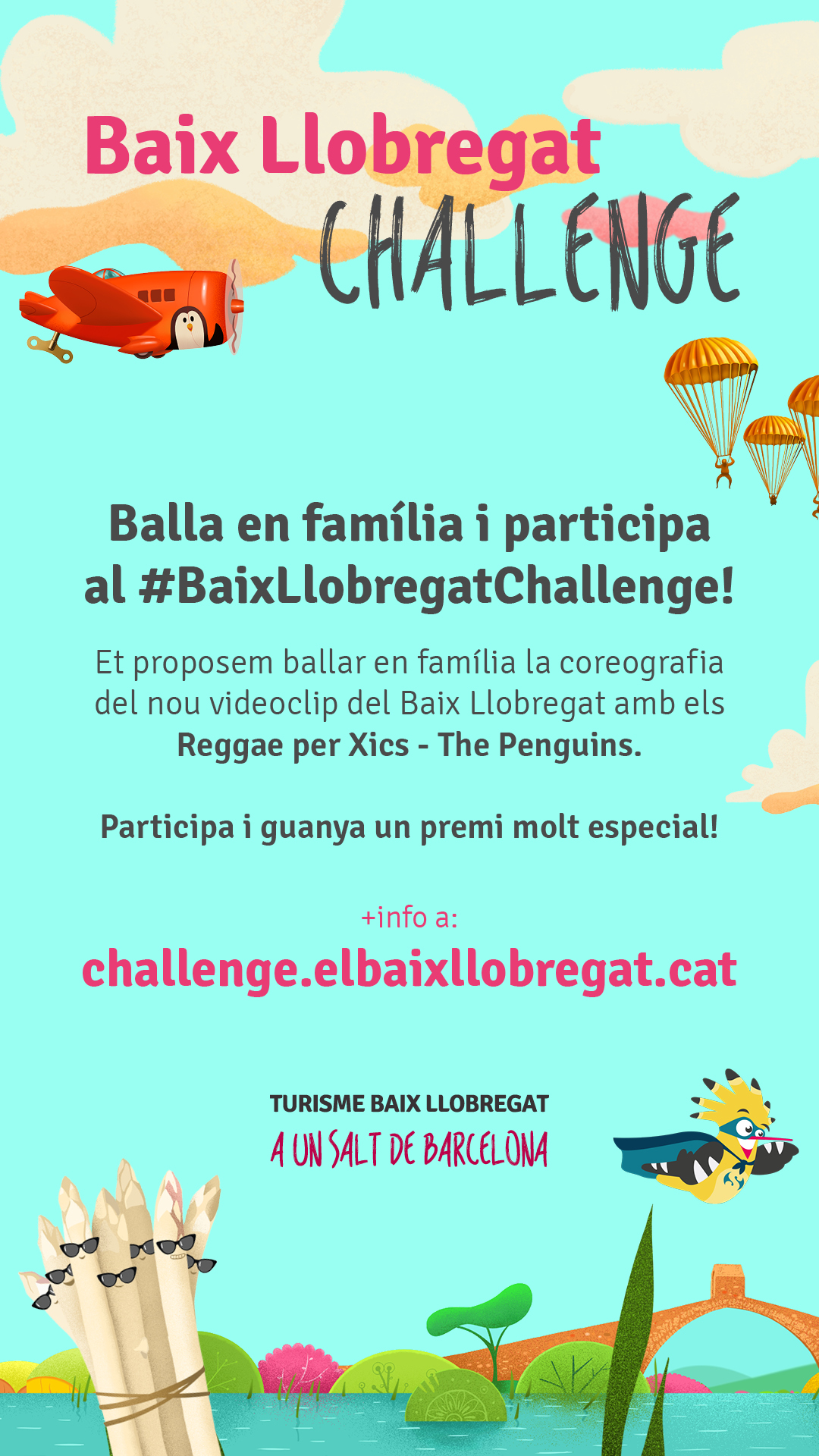 Si us agrada ballar, el Consorci de Turisme del Baix Llobregat us proposem un divertit repte per fer en família aprofitant aquest temps de confinament i coincidint amb el llançament del nou videoclip de la cançó del Baix Llobregat que ens mostra la diversitat d'atractius que ofereix la comarca, del delta fins a Montserrat, i que ha estat realitzat pel conegut grup musical Reggae per Xics - The Penguins.